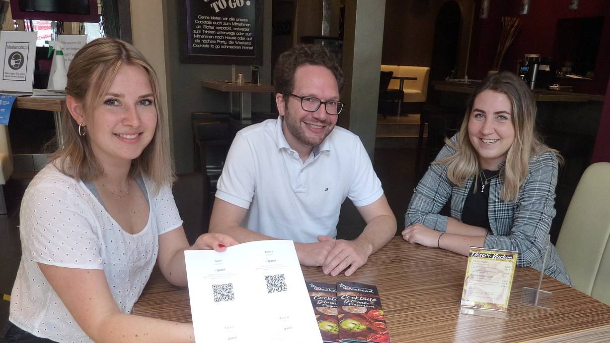 Im Weekend können die Gäste ihre Kontaktdaten bei Betreiber Nicolas Hülser und seinen Mitarbeiterinnen Nele Hinrichs (l.) und Lisa Hecker mit einem QR-Code per Handy hinterlassen. | © Sabine Kauke