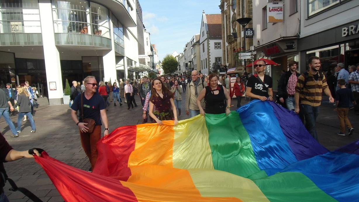 Die Regenbogenfahne steht für gesellschaftliche Diversität. Angehörige der LGBT-Szene benutzen sie auch in Paderborn gerne, um auf Diskrimierungen hinzuweisen und für Toleranz und Gleichberechtigung zu demonstrieren. | © NW-Archiv