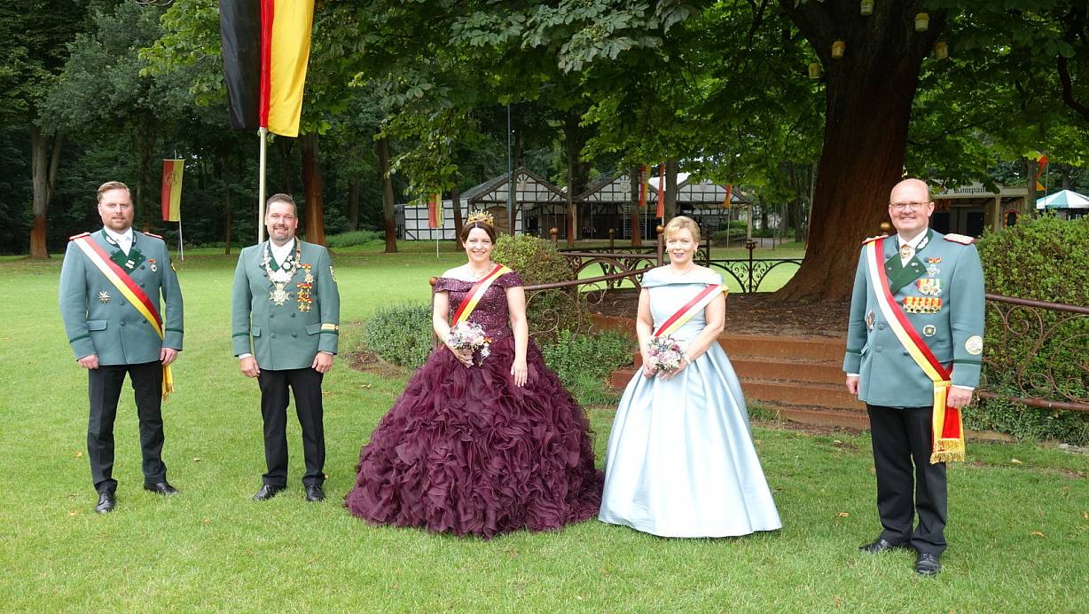 Zumindest für den Videodreh durften sich das Königspaar Dirk Scholl und Jana Mirk sowie (v.l.) Zeremonienmeister Ralph Driller, Zeremonienmeisterin Birgit Methling sowie Oberst Thomas Spieker ins "Schützenfest-Outfit" werfen. | © Christian Nolden