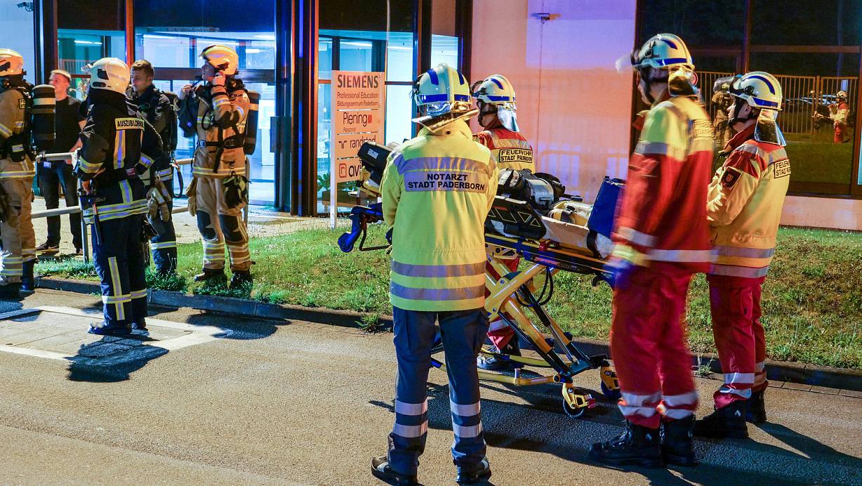 Während in den Büros noch gearbeitet wird, warten Führungskräfte der Feuerwehr und und der Rettungsdienst auf das Ergebnis der Erkundungen im Betriebsgebäude. | © Ralph Meyer