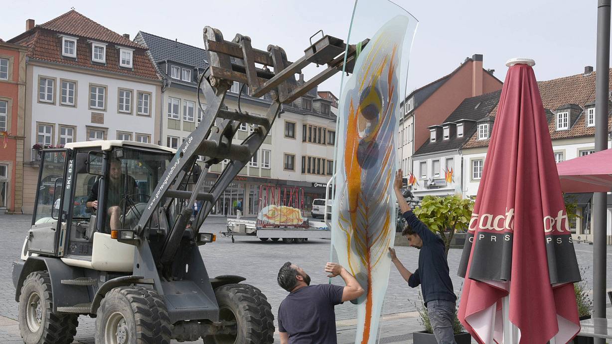 Mitarbeiter der Glasmalerei Wilhelm Peters ließen den ersten Teil des Werkes von Künstler Tobias Kammerer auf dem Paderborner Marktplatz Wirklichkeit werden: Die Glaskunststelen verweisen in ihren Farben auf die Himmelsrichtungen und spannen so ein Netz über den Paderborner Marktplatz – blau für den Norden, grün für den Osten, orange für den Süden und rot für den Westen. Die Installation will somit aktiv erschlossen werden.