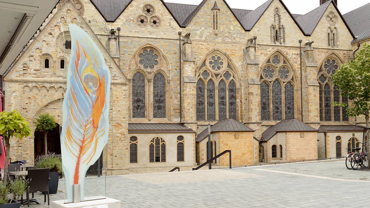 Die Kunstinstallation "Liborius in der Welt" ist auf dem Marktplatz zu sehen. Vier Glasstelen symbolisieren die Himmelsrichtungen. | © Lena Henning