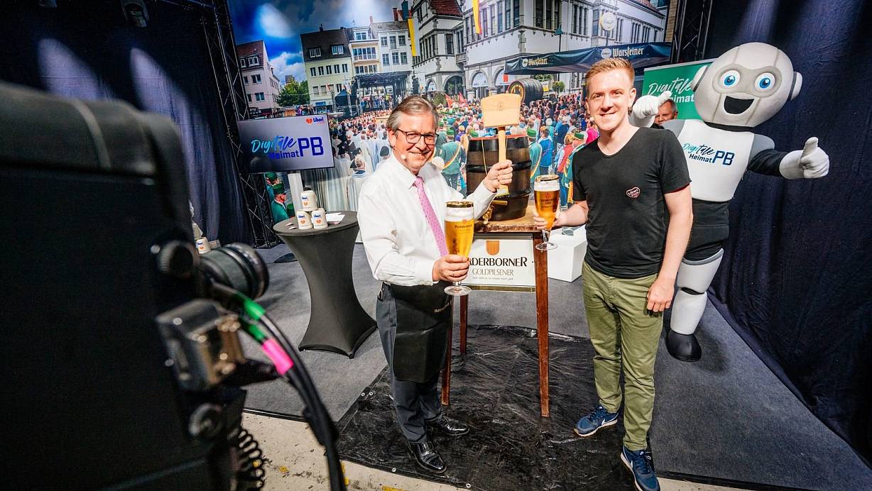 Statt auf dem Rathausplatz eröffnet Bürgermeister Michael Dreier (l.) mit Radio-Hochstift-Moderator Tobias Fenneker das Liborifest 2020 im Aufnahmestudio. | © Besim Mazhiqi
