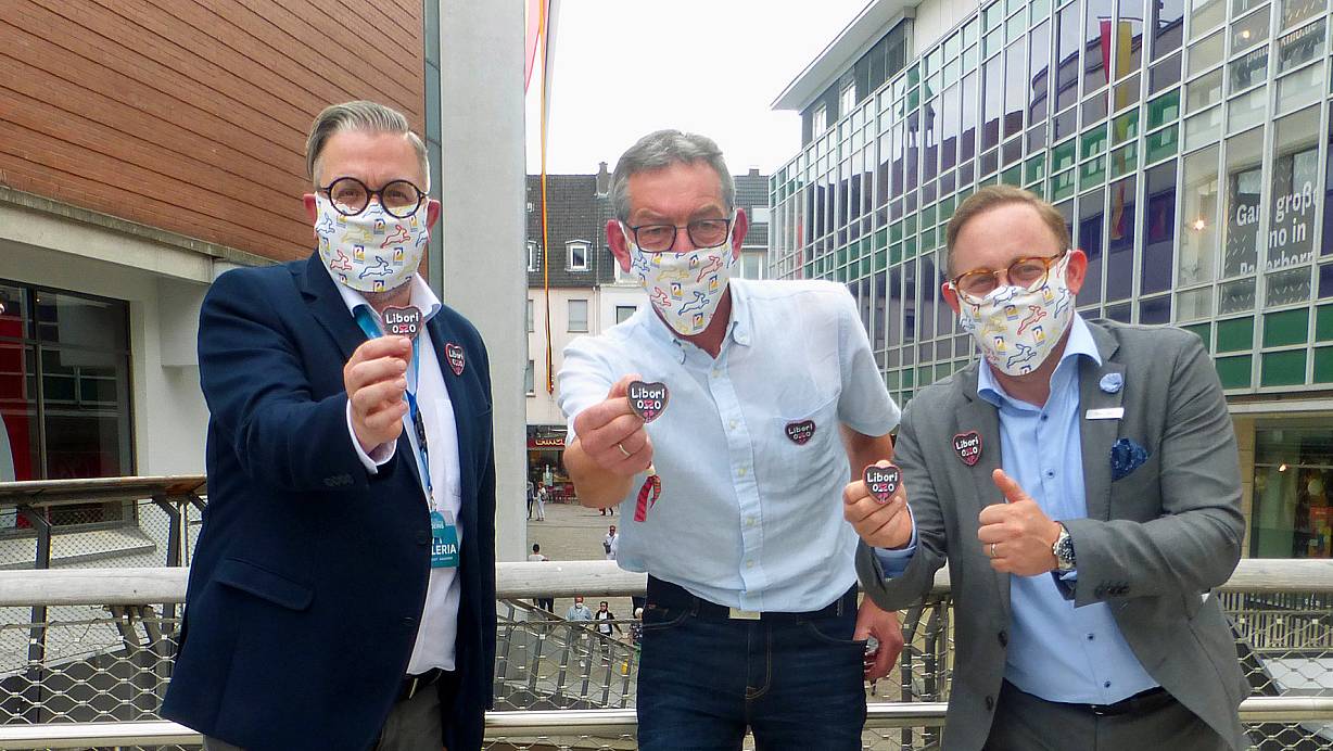 Galeria-Filialgeschäftsführer Michael Stauber (l.) und Klingenthal-Geschäftsleiter Daniel Lükel (r.) nehmen die von Karl Heinz Schäfer überbrachten Libori-Herzen entgegen. | © Verkehrsverein Paderborn