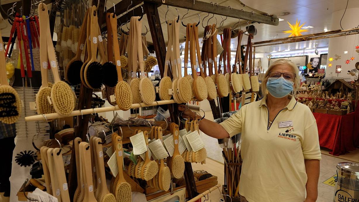 Lieselotte Liepert präsentiert ihre Bürsten diesmal nicht im Holzhaus aus dem Kleinen Domplatz, sondern in einem 65 Jahre alten historischen Marktstand im Erdgeschoss der Galeria Kaufhof. | © Hans-Hermann Igges