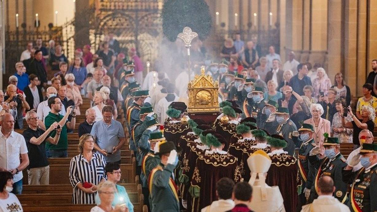 Paderborn. Mit einer Festandacht und der Beisetzung der Reliquien des Patrons des Erzbistums Paderborn, des Domes und der Stadt Paderborn wurde am Dienstagnachmittag das Libori-Triduum abgeschlossen. Nach der von Erzbischof Hans-Josef Becker geleiteten Sakramentsandacht im Dom wurde der vergoldete Schrein mit den Reliquien des heiligen Liborius wieder zurück in die Krypta des Gotteshauses getragen und dort im Altar beigesetzt. Die Prozession mit den Reliquien konnte in diesem Jahr nur innerhalb des Domes stattfinden. Zuvor spendete Erzbischof Becker den sakramentalen Segen.