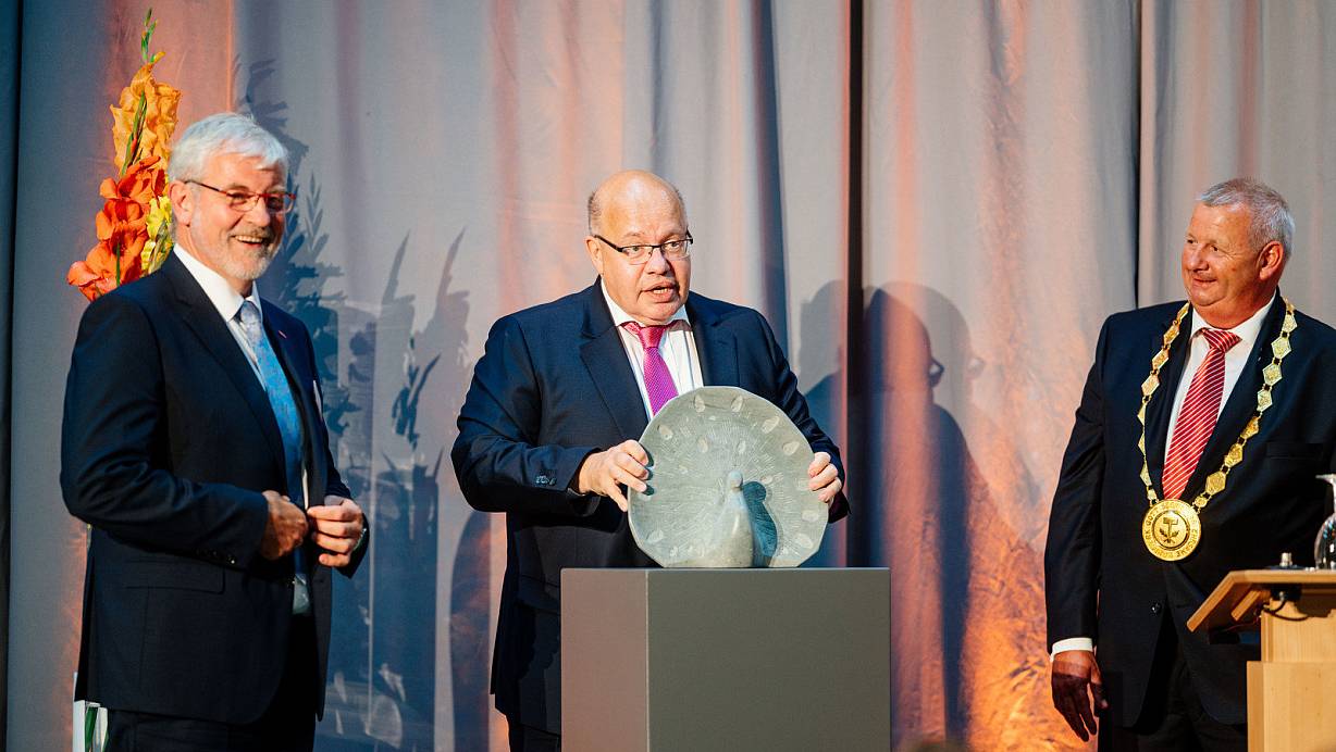 Bundeswirtschaftsminister Peter Altmaier (Mitte), bekommt von Geschäftsführer Peter Gödde (l.) und Vorsitzenden Mickel Biere den Libori-Pfau verliehen. | © Besim Mazhiqi