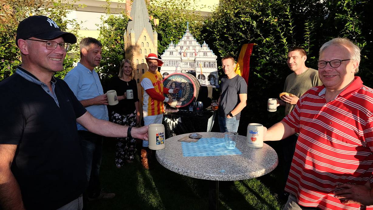 Zum privaten Bierbrunnen luden Juliane und Claus Wiesbrock Freunde und Bekannte. Als "Jubelhennes" zapfte der Hausherr vor stilechter Kulisse. | © Hans-Hermann Igges