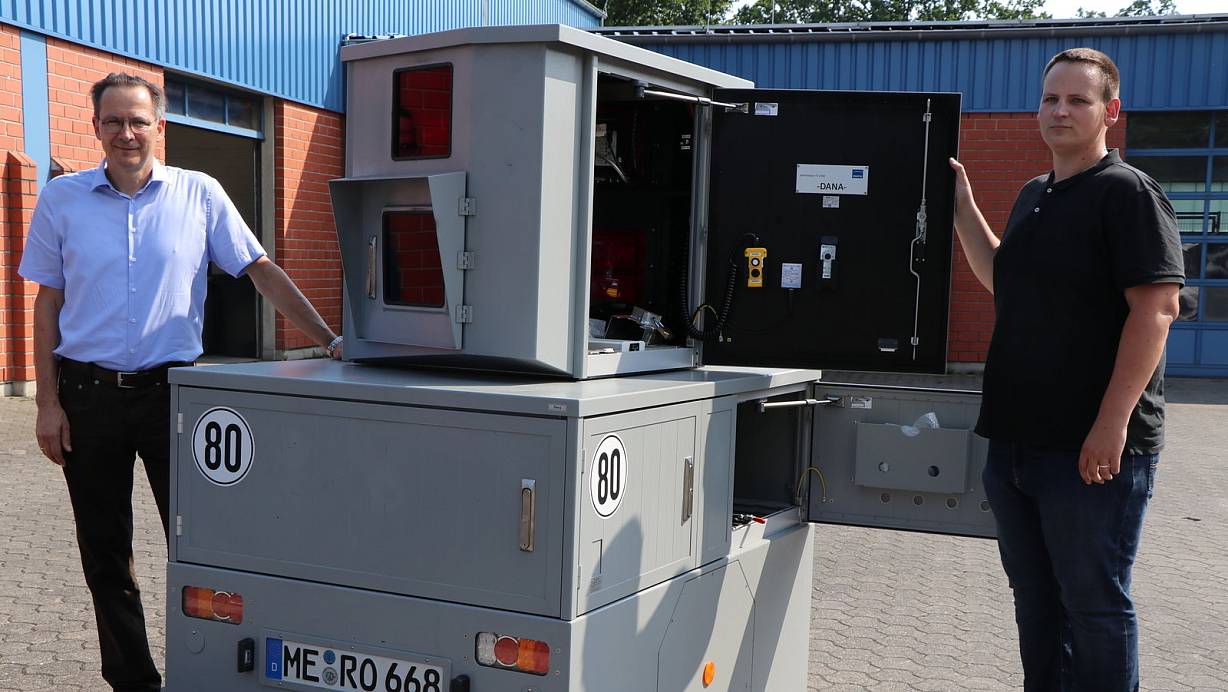 Jens Reinhardt (Sprecher der Stadt Paderborn/l.) und Michael Zapf vom technischen Support der Firma Jenoptik mit der mobilen Blitzeranlage, die vom Werk aus erst einmal den Namen "Dana" trägt. | © Holger Kosbab