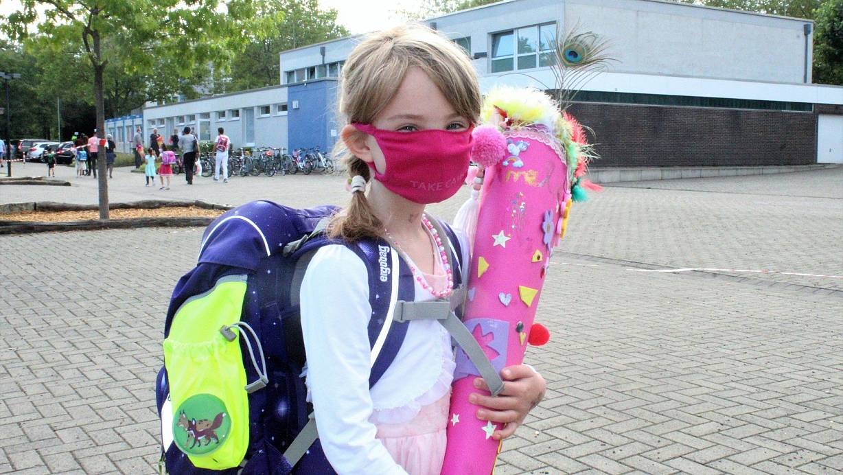 Amelie Kirsch (6) wird gleich ihre neuen Mitschüler der Klasse 1b der Stephanus-Grundschule kennenlernen. Die Maske hat sie sich selbst ausgesucht und bei der Schultüte hat sie fleißig geholfen. | © Anastasia von Fugler