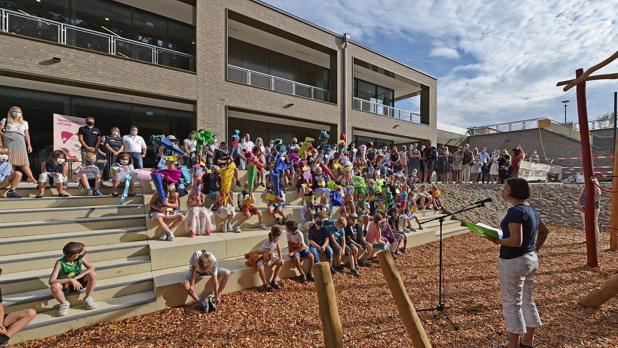 Paderborn. Am Rande des Paderquellgebietes starten am Donnerstag 38 I-Dötze ihr Schulleben in einem ganz neuen Grundschulgebäude. Und auch für die Zweitklässler der Grundschule St. Michael, die ihr erstes Schuljahr in den Räumen der ehemaligen Busdorfschule verbracht hatten, war es ein ganz besonderer Tag. Die Schülerinnen und Schüler nahmen das vom Erzbistum Paderborn errichtete Schulgebäude in Besitz, begrüßt von der kommissarischen Schulleiterin Anne Cordes.