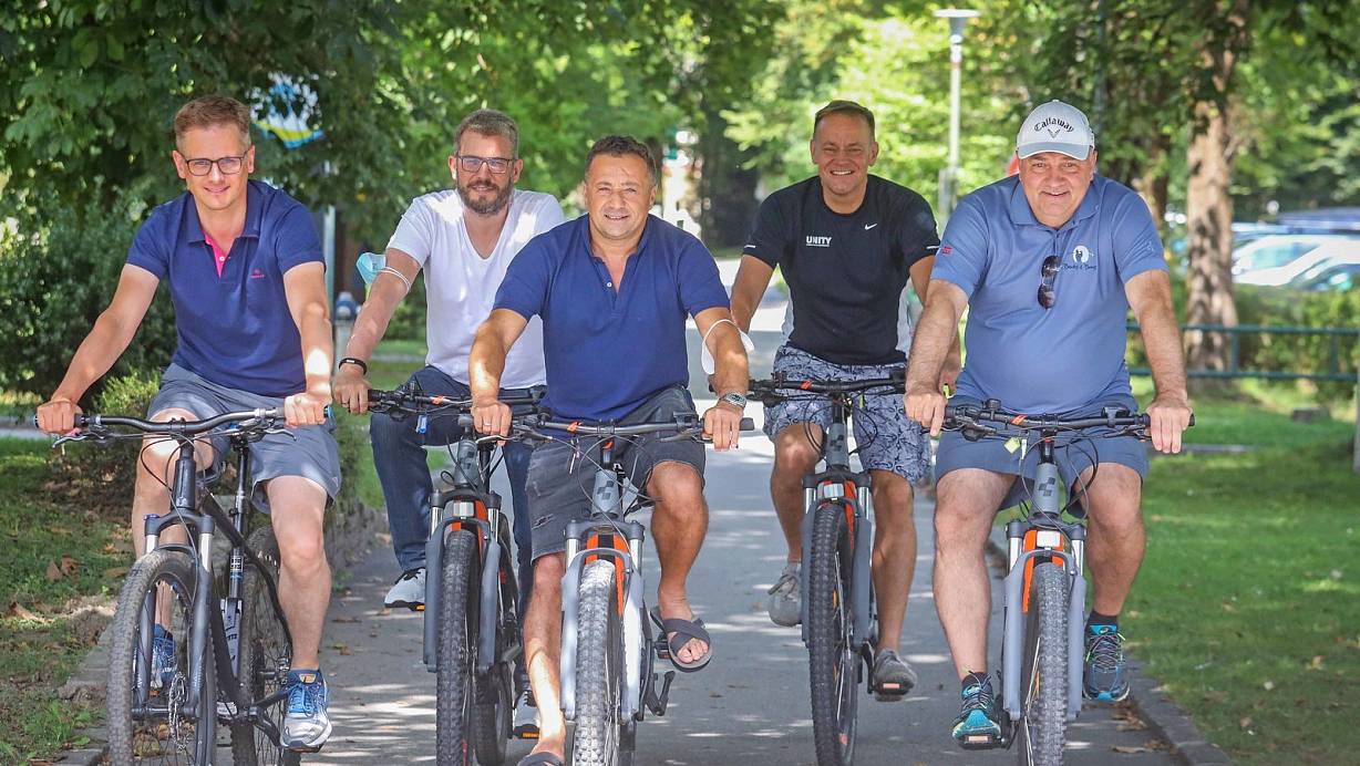 Mitglieder des Wirtschaftsrates des SC Paderborn besuchen das Trainingslager des SCP in Villach. Dabei sind (v. l.) Carsten Linnemann, Stefan Rees, Orhan Dag, Tomas Pfänder und Thomas Sagel viel auf E-Montainbikes unterwegs. | © Sarah Jonek