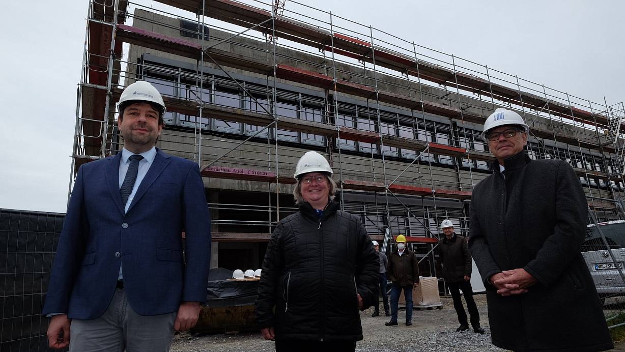 Im Zeit- und Kostenrahmen liegt der Forschungsbau X der Universität Paderborn am Mersinweg auf dem Campus. Darüber freuen sich (v. l.) Christian Plessl, Simone Probst und Wolfgang Feldmann. | © Hans-Hermann Igges