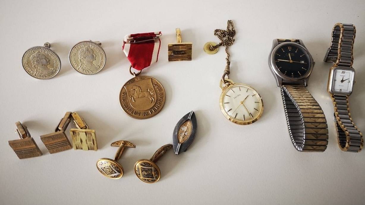 Bei den Schmuckstücken handelt es sich unter anderem um zwei Broschen auf dem in Bild und Text eine Gravur von Maria Theresia von Österreich zu sehen ist. Auf einer Medaille an einem rot-weißen Band ist ein Pferd zu sehen sowie als Text die Aufschrift Sturmflut 16. Februar 1962 zu lesen. Auf der Rückseite ist eine Welle eingraviert. Weitere Gegenstände sind eine Taschenuhr, zwei silberne Armbanduhren sowie Ringe.