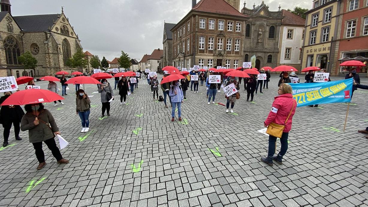 Mit aufgespannten, roten Regenschirmen wird der geforderte Rettungsschirm für Beschäftigte im öffentlichen Dienst symbolisiert. | © Mareike Gröneweg