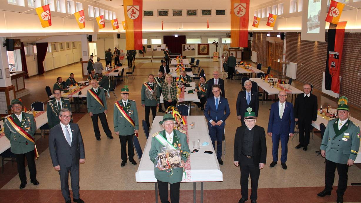 Seit 1952 ist Konrad Mührhoff (Mitte) in der St.Hubertus Schützenbruderschaft. Zusammen mit anderen Gastrednern wie Michael Dreier (3.v.l.) oder Cartsen Linnemann (6.v.r.) begeht er coronabedingt mit wenigen weiteren Schützen den Festakt zum 100-jährigen Jubiläum des Vereins. | © Moritz Jülich