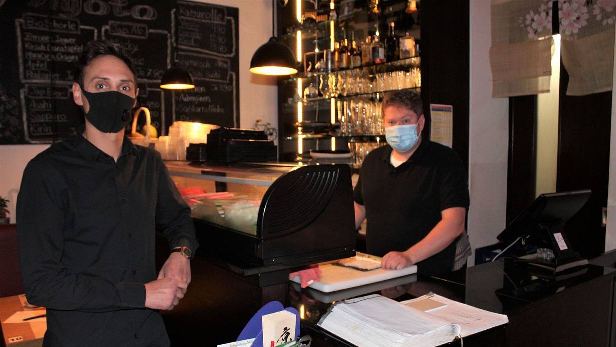 Kurz vor 16 Uhr sind die Mitarbeiter Patrick Wille (v.l.) und Peter Spreier von Kyoto Sushi Bar dabei, alles für die tägliche Öffnung vorzubereiten. Die Öffnungszeiten sollen auch im November die gleichen bleiben, nur dass die Gäste dann ihr Sushi mit nach Hause nehmen müssen. | © Anastasia von Fugler