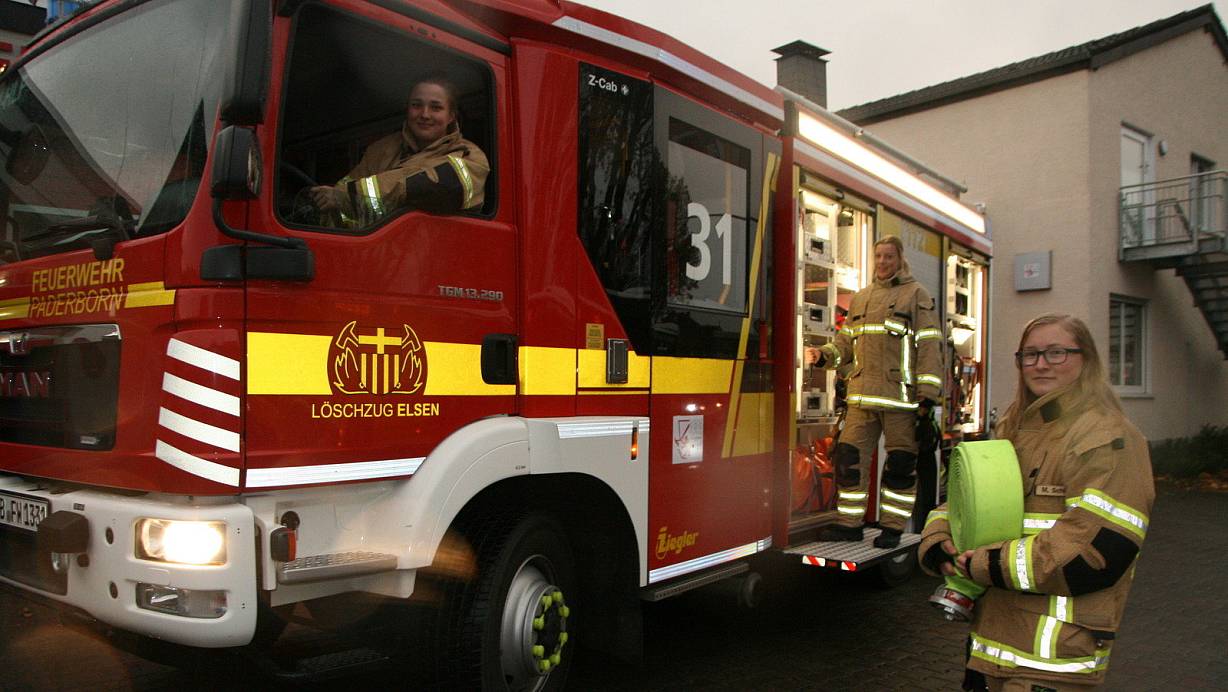 Julia Höschen (v. l.), Veronika Simon und Phoebe Drewer sind für den Löschzug Elsen jederzeit einsatzbereit. | © Andreas Götte