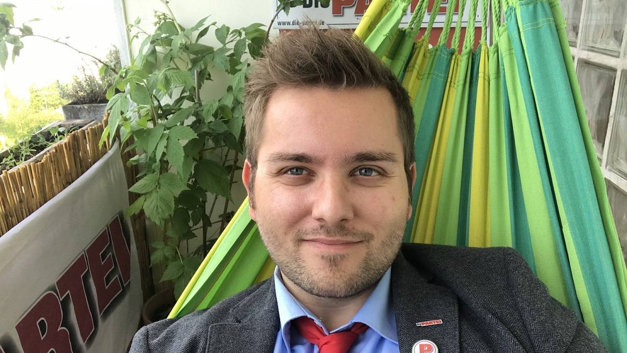 Pierre Schelper ist Vorsitzender der Partei Die Partei im Kreis Paderborn und Mitglied des Stadtrates. Dass er für dieses Foto in einer Hängematte liegt, gehört zur satirischen Selbstdarstellung. | © Die Partei