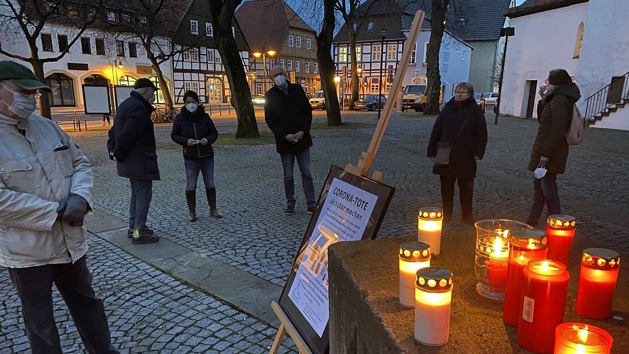 Einige haben sich am Freitagabend auf dem Kirchplatz vor St. Heinrich und Kunigunde getroffen, um den Menschen zu gedenken, die im Zusammenhang mit einer Coronainfektion gestorben sind. | © Mareike Gröneweg