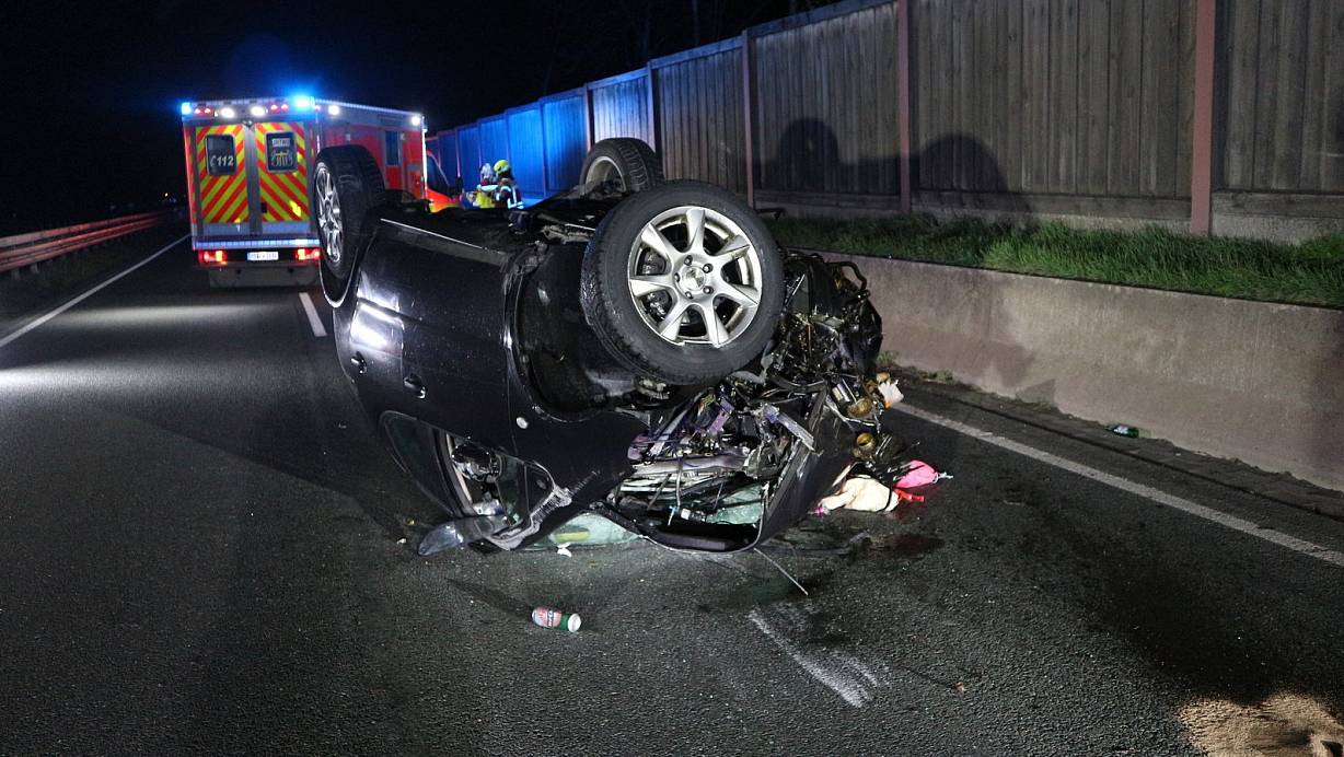 Gegen 2.40 Uhr wurde die Feuerwehr der Stadt Paderborn zu dem Unfall auf der B 64, Höhe Abfahrt Borchener Straße in Fahrtrichtung B1/ Salzkottener Straße, alarmiert. Nach bisherigen Erkenntnissen geriet der Mercedes A-Klasse etwa 800 Meter vor der Abfahrt Borchener Straße nach rechts auf die Bankette und kam ins Schlingern. Das Auto prallte auf den Betonsockel am Beginn der Lärmschutzwand. Dabei wurden ein Rad und ein Teil der Vorderachse abgerissen. Der Mercedes schleuderte nach links gegen die Mittelleitplanken und überschlug sich mehrfach auf der Fahrbahn. Völlig zerstört blieb das Auto auf dem Dach liegen.