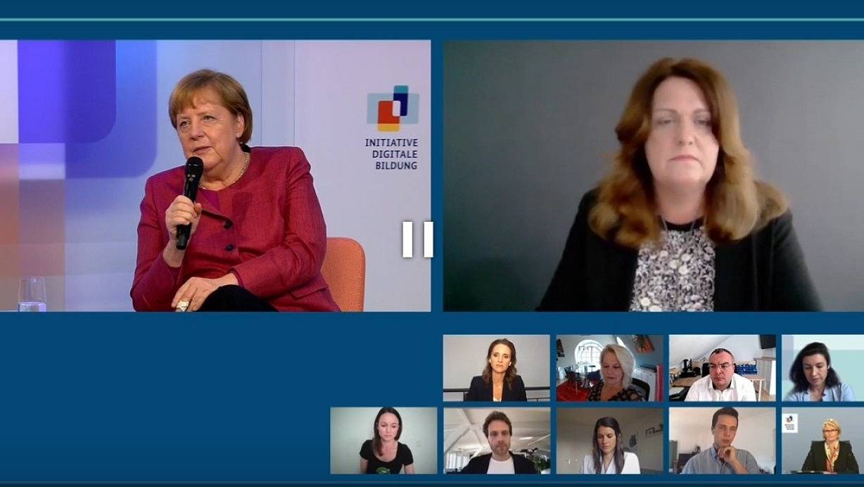 Bundeskanzlerin Angela Merkel (l.) hat zum Online-Dialog der Initiative Digitale Bildung eingeladen. Mit dabei war unter anderem Professorin Birgit Eickelmann von der Universität Paderborn. | © Screenshot: Peter Heidbrink / Livestream Bundesregierung.de
