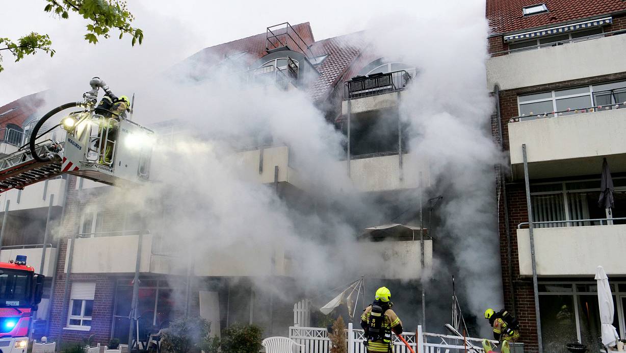 Ein Balkonbrand breitet sich rasend schnell auf die höher gelegenen Etagen aus. Die Polizei ermittelt wegen des Verdachts der fahrlässigen Brandstiftung.
