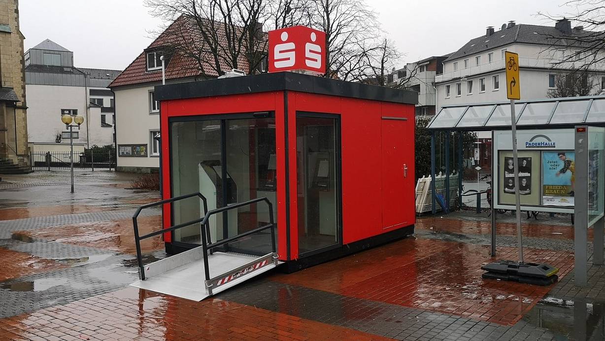 Paderborn. Die Sparkasse Paderborn-Detmold investiert im Riemekeviertel in Paderborn. Es sollen neue Wohnungen und eine Filiale entstehen, berichtet Oliver Bekirsch von der Sparkasse Paderborn-Detmold. Um den Service für die Kunden in der Umbauphase anbieten zu können, habe das Kreditinstitut einen Container mit Selbstbedienungstechnik direkt vor der Herz-Jesu-Kirche bereitgestellt. Am vergangenen Wochenende hat ein unbekannter Täter hier im wahrsten Sinne des Wortes zugeschlagen, heißt es einer Presseinfo der Sparkasse.