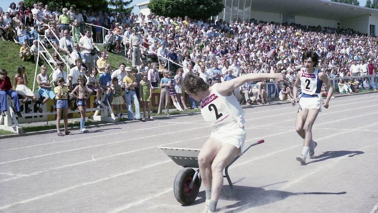 Schubkarrenrennen im Inselbadstadion zu Libori 1975. Die Athleten mussten alle Viertelrunde wechseln, was wir vermutlich hier sehen. | © Stadt- und Kreisarchiv Paderborn
