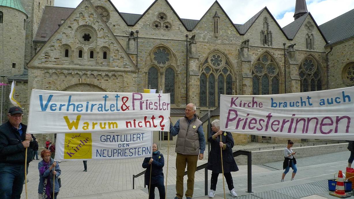 "Wir sind Kirche" demonstriert während der Priesterweihe 2019 vor dem Dom. | © Archivfoto: Loni Maoro