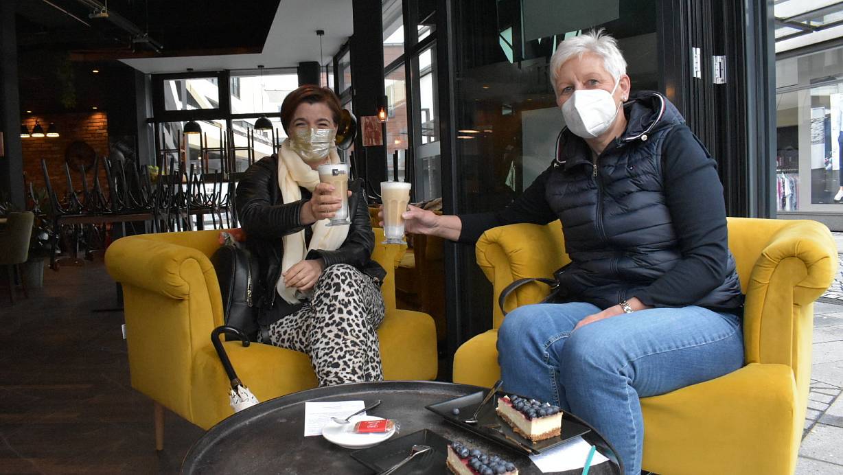 Heike Satzky (l.) und Maria Bökmann belohnen sich nach getaner Arbeit mit einem Feierabend-Kaffee und einen Stück Kuchen im CofeeIn. | © Julia Stratmann