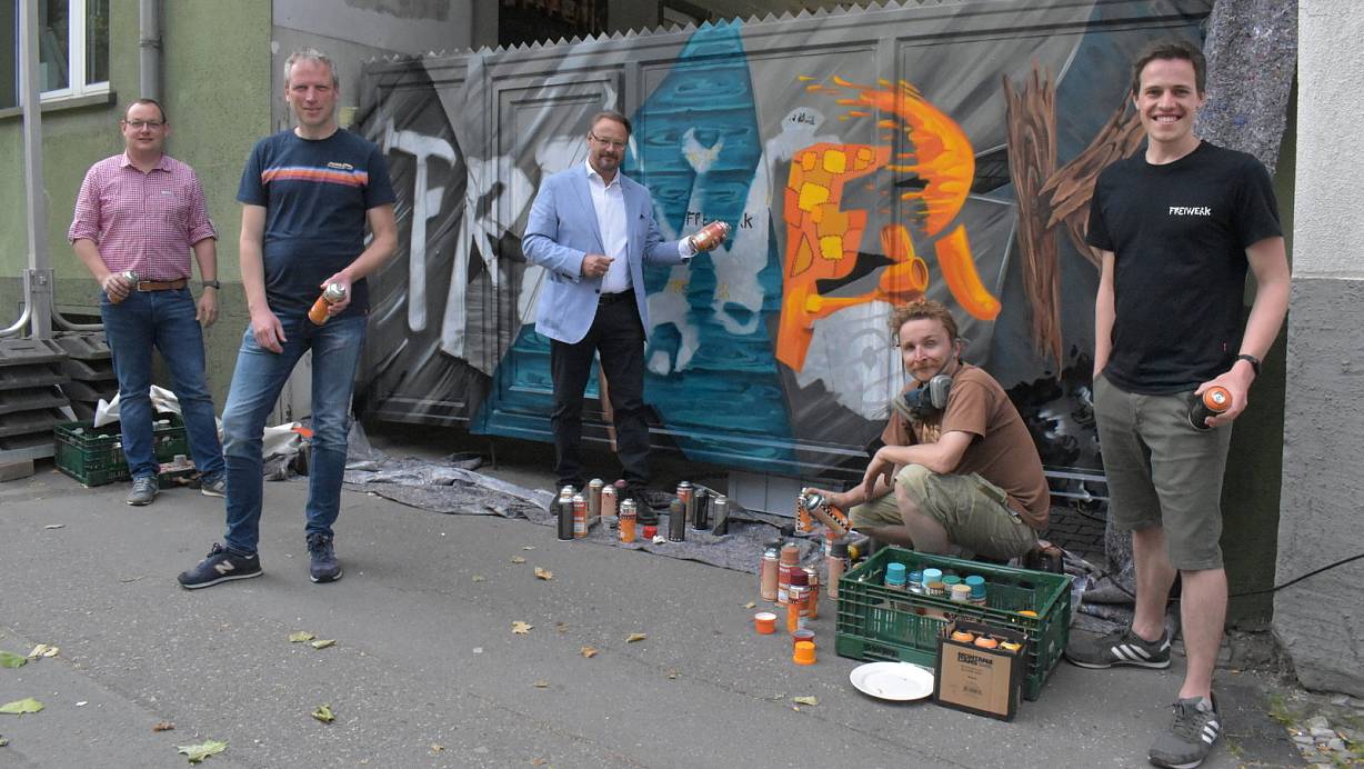 Graffiti-Künstler Lukas Michalski (2. v. r.) arbeitet an der neuen Gestaltung des Hoftors. Andreas Dettki (v.l.) und Jörg Münster vom Gebäudemanagement, Elmar Kloke, Vorstandsvorsitzender der Bürgerstiftung und Lennart Lorenz, Vorstandsmitglied des Freiwerks begutachten das Werk. | © Julia Stratmann