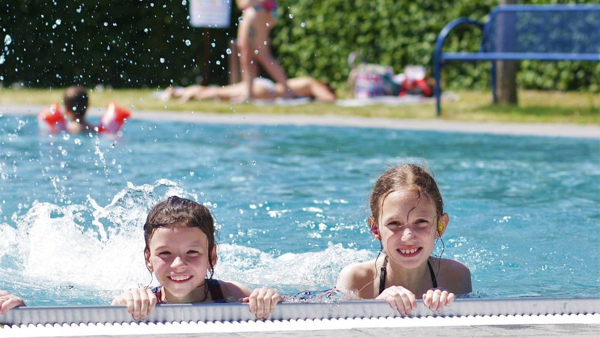 Clara und Nele planschen im Rolandsbad und freuen sich über die kühle Erfrischung bei Temperaturen um die 30 Grad. | © Jessica Eberle