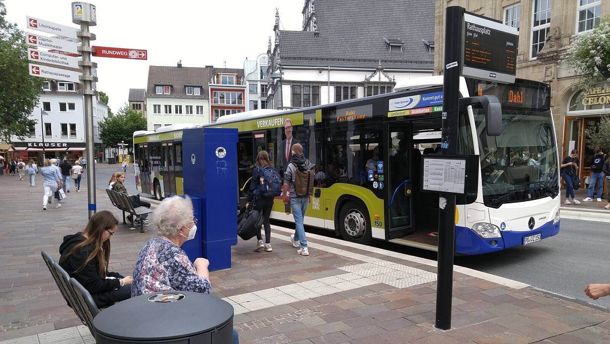 An den Bushaltestellen und in den Bussen selbst gilt nach wie vor Maskenpflicht. Der Rückgang bei den Fahrgastzahlen ist derzeit nach Angaben des Unternehmens immer noch beträchtlich. | © Hans-Hermann Igges