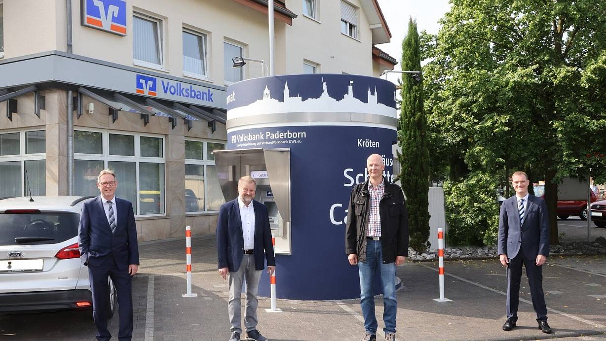 Der Automat in Form einer Rotunde steht vor der ehemaligen SB-Filiale an zentraler Stelle im Ort an der Bielefelder Straße. „Wir haben in die erhöhte Sicherheit unserer Kundinnen und Kunden investiert und mit diesem neuen Standort eine gute Lösung für Sennelager gefunden", freut sich Lin Thiele, Regionalleiter der Volksbank Paderborn.