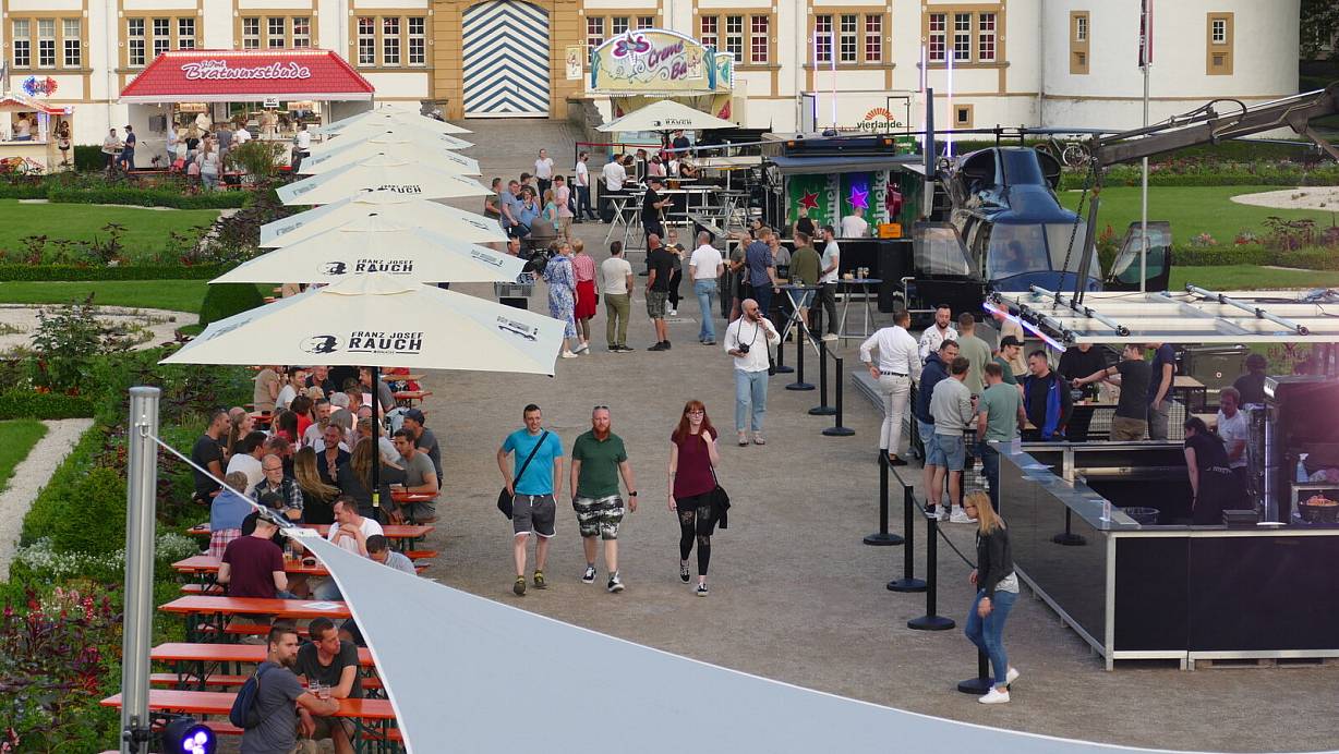 Auf der Mittelachse im Schlosspark wartet Gastronom Fabian Utermöhle zudem mit Attraktionen fürs Auge auf. Denn sein Team serviert die Getränke unter anderem aus einer Pistenraupe, einem Hubschrauber oder einem alten Gerätewagen der Feuerwehr.