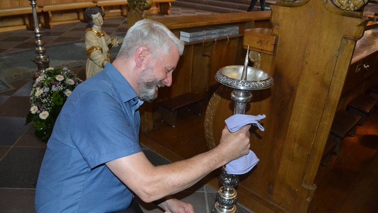 Blitzblank sollen die Kerzenständer sein: Küster Robert Schäfers legt mit dem Poliertuch Hand an. | © Peter Heidbrink
