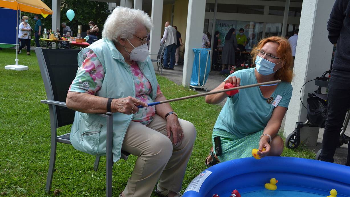 Elisabeth Flott (85) probiert ihr Glück beim Entenangeln. Unterstützt wird sie von Ute Clausen (Leitung Sozialer Dienst). | © Peter Heidbrink