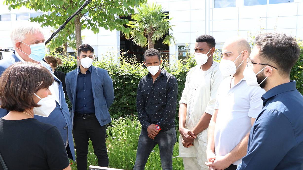 Karl-Josef Laumann im Gespräch mit Geflüchteten, unter anderem Armin Mohammadian (l.) und Walid Ali (r.) von der Firma RTB. | © Holger Kosbab