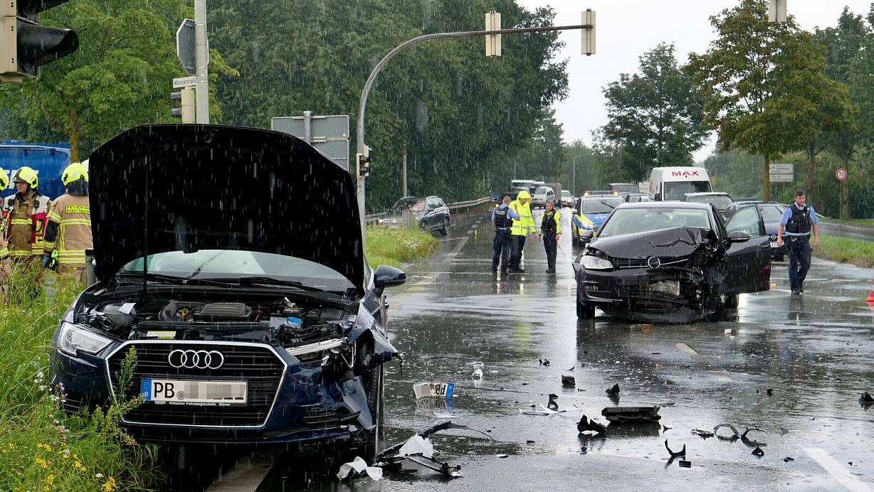 Beim Zusammenstoß von zwei Autos auf der Kreuzung Heinz-Nixdorf-Ring/Münsterstraße werden beide Fahrerinnen verletzt. | © Ralph Meyer
