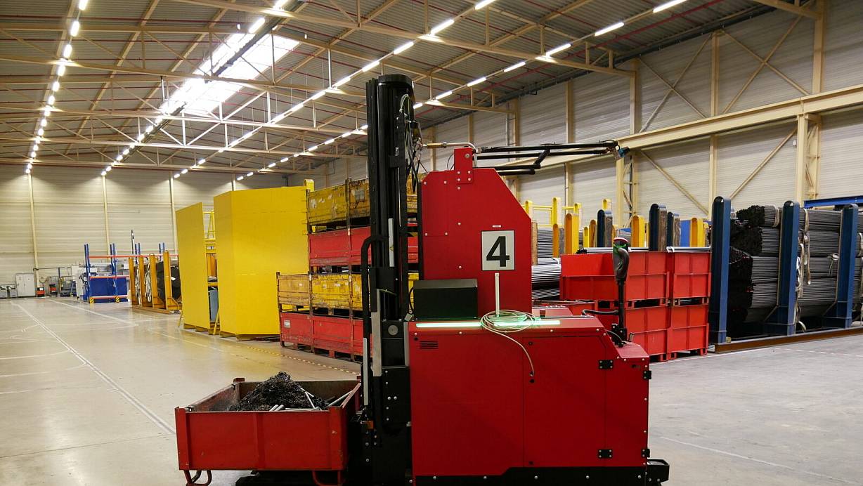Ein mit Ausschuss beladenes Fahrzeug des fahrerlosen Transportsystems auf dem Weg zur Kippstation. | © Benteler