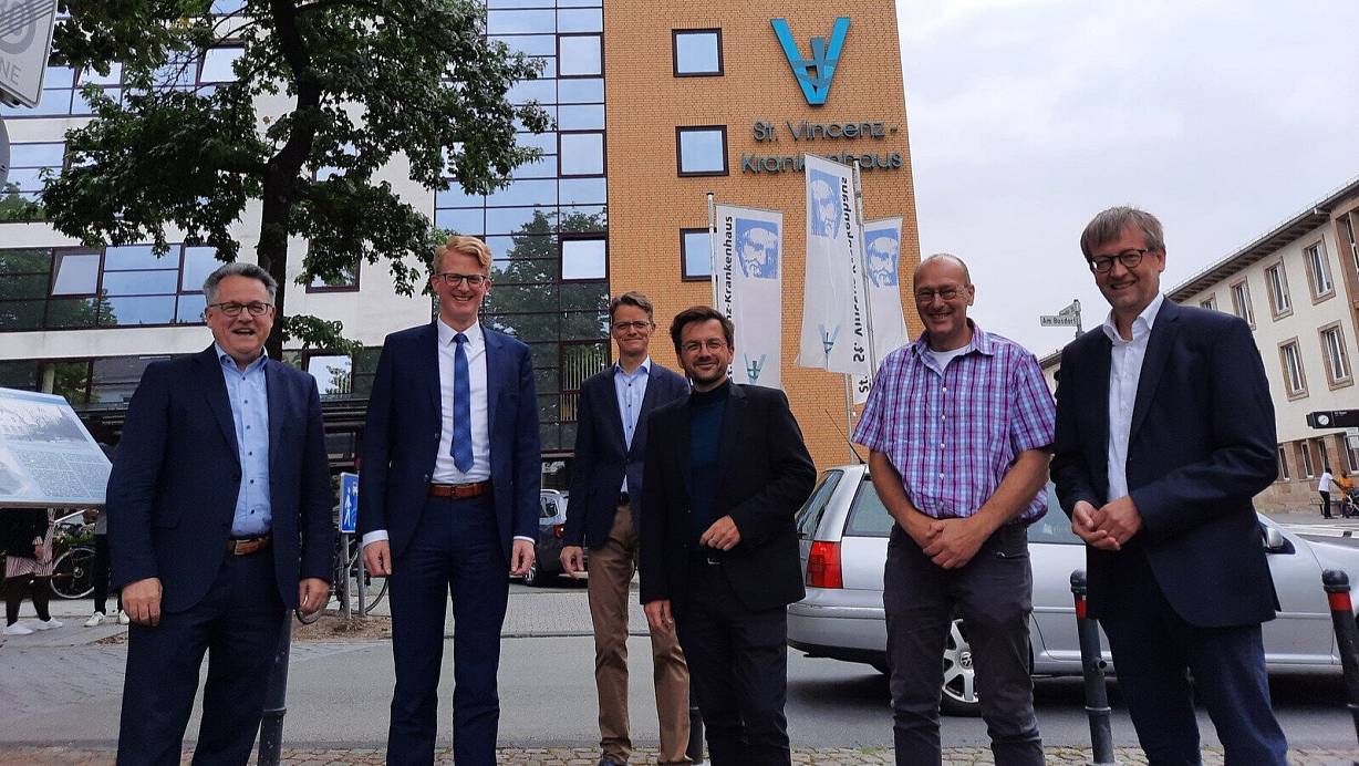 Geschäftsführer Josef Dülling (l) und der ärztliche Leiter Martin Baur (3. v.l.) begrüßen Michael Sprink (2. v.l.), SPD-Landeschef Thomas Kutschaty, Roger Voigtländer und Burkhard Blienert im St.-Vincenz-Krankenhaus. | © Marc Schröder