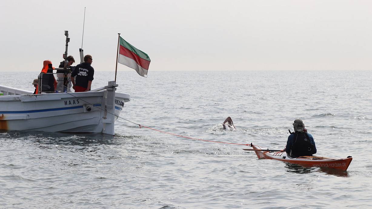 André Wiersig auf dem Weg nach Helgoland - begleitet von Kajaks und einem Beiboot. Festhalten war allerdings verboten. Die Begleiter dienten der Kontrolle und der Verpflegung. | © Erik Eggers