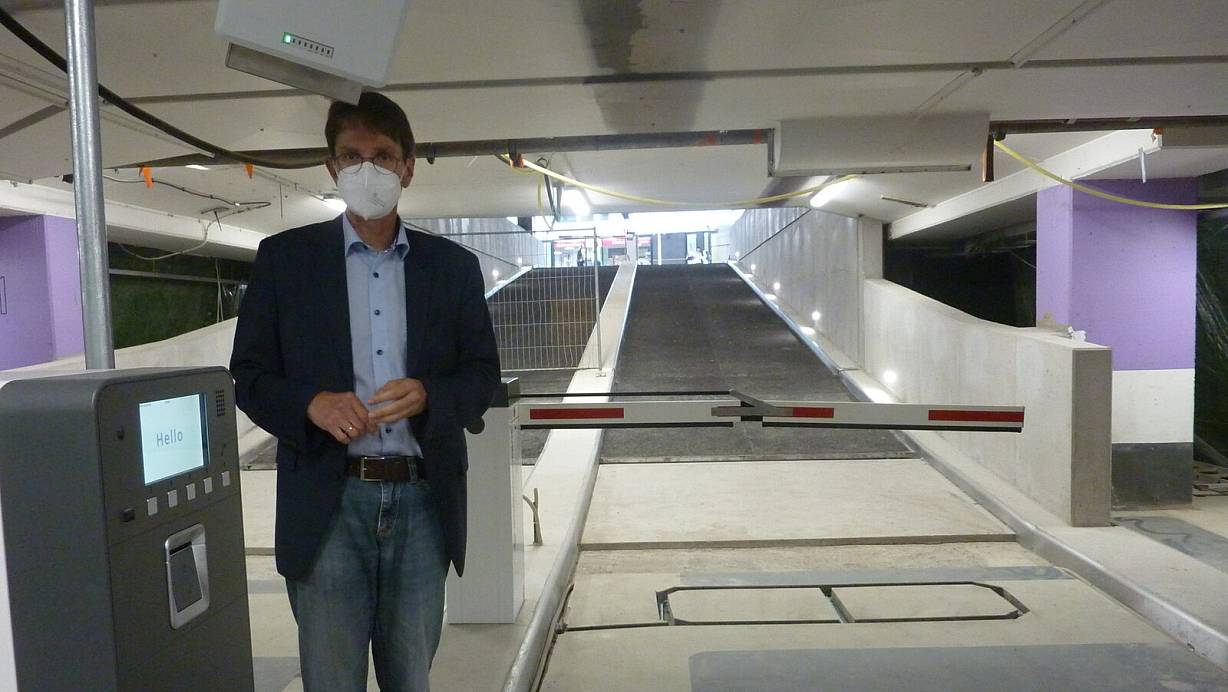 Dietmar Regener, stellvertretender Betriebsleiter beim ASP, zeigte Ausschussmitgliedern die Baufortschritte in der Tiefgarage am Königsplatz. Die Steigung der neuen Ein- und Ausfahrt an der Marienstraße ist im Vergleich zur bisherigen Zufahrt für Autofahrer deutlich angenehmer. | © Sabine Kauke