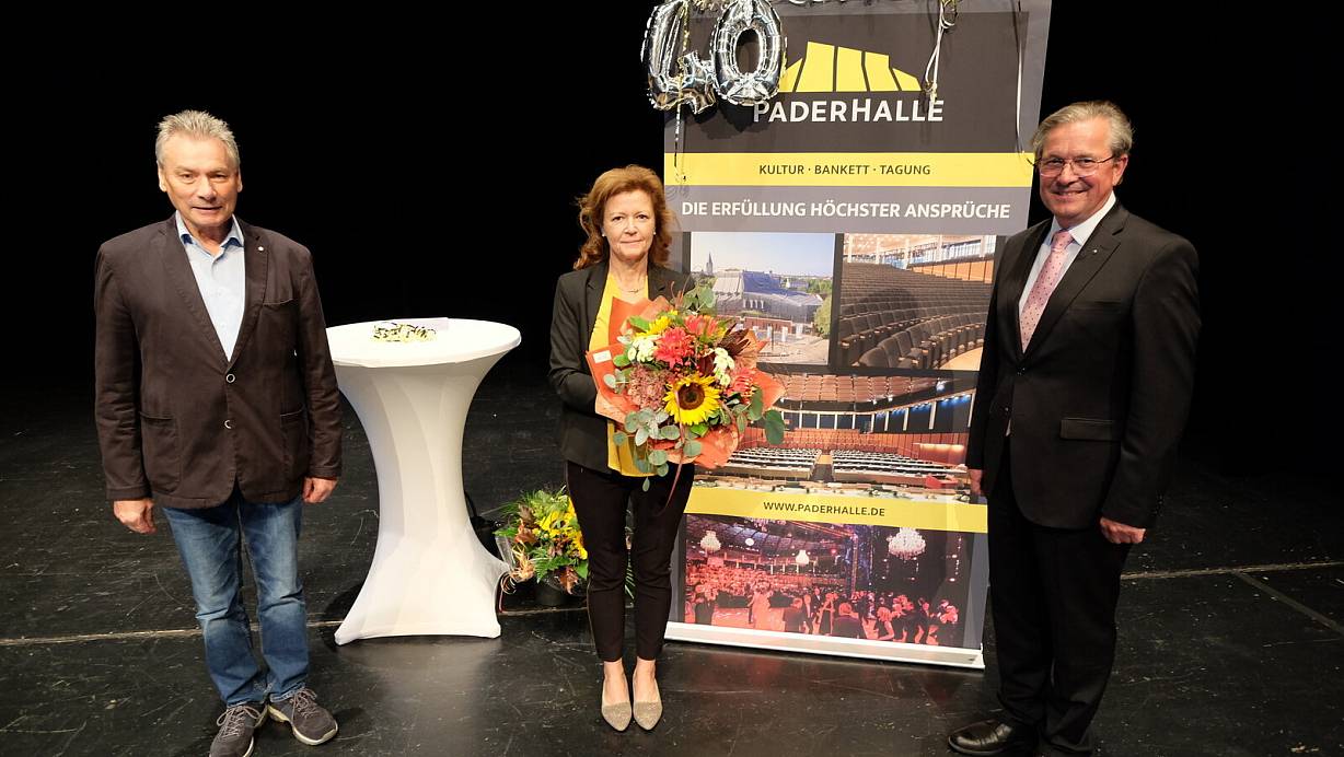 Zum 40. Geburtstag der Paderhalle grautlierten Geschäftsführerin Maria Rodehuth Bürgermeister Michael Dreier (r.) und Dietrich Honervogt, Aufsichtsratsvorsitzender der Stadthallen-Betriebsgesellschaft Paderborn. | © Hans-Hermann Igges