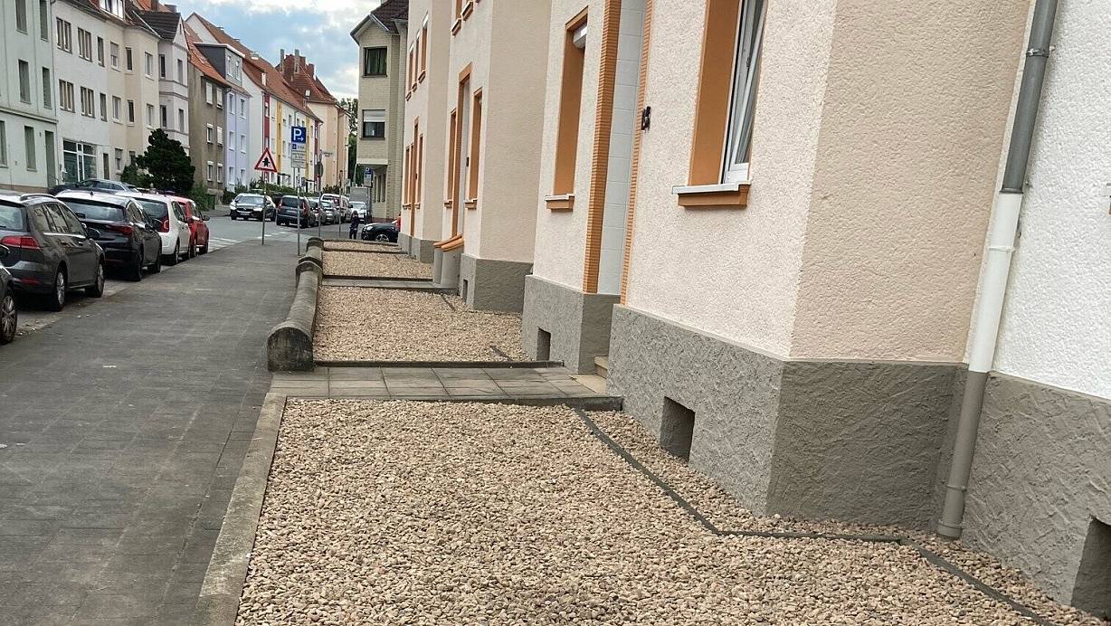 Ersetzt eine Schotterfläche an einem Haus des Spar- und Bauvereins Hecken und Rasen? Vorstandssprecher Thorsten Mertens kann die Situation aufklären.