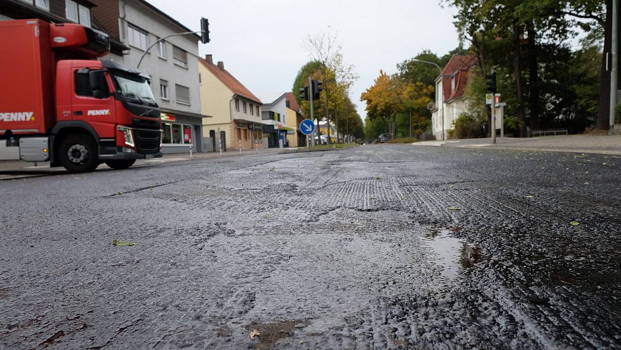 An der Bielefelder Straße in der Ortsdurchfahrt von Sennelager laufen derzeit die Asphaltarbeiten. Bei Regenwetter verzögern sie sich allerdings. | © Hans-Hermann Igges