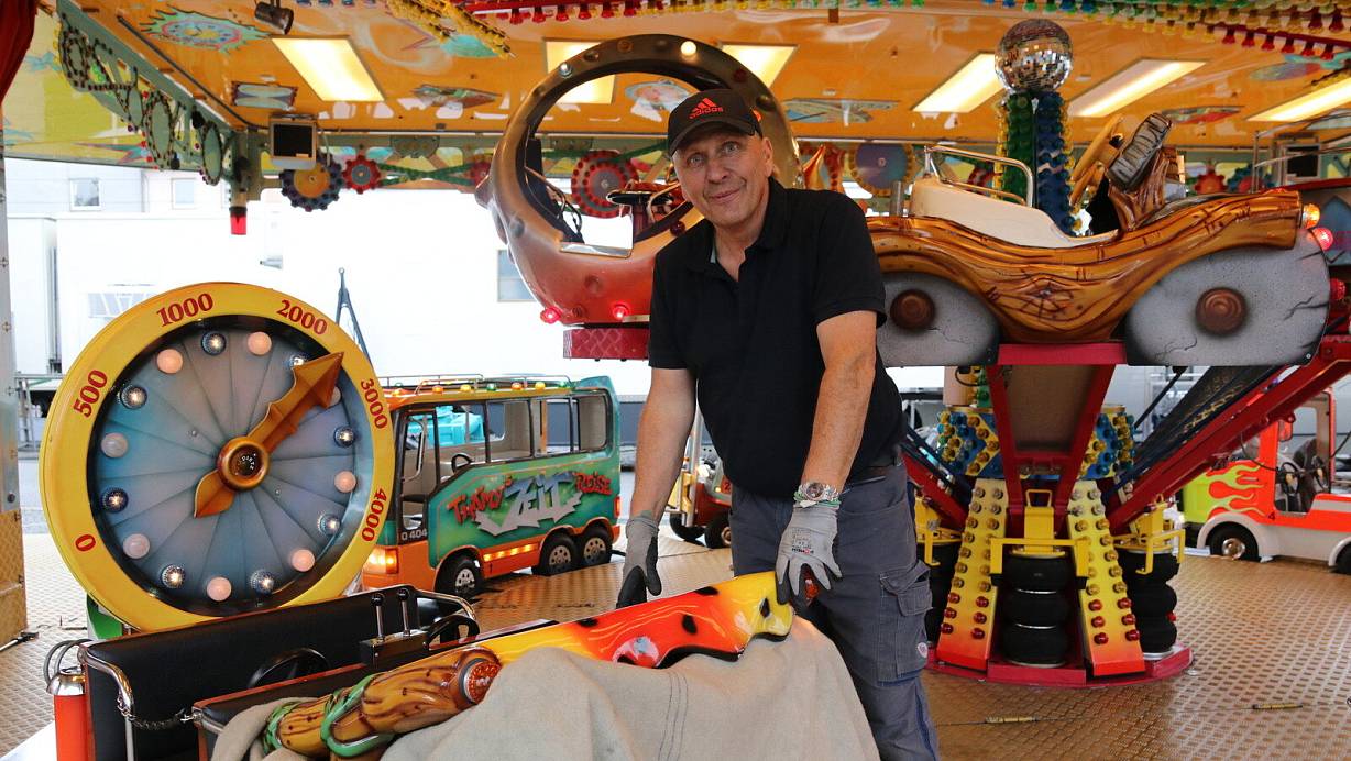Hans-Otto Bröckling, erster Vorsitzender des Paderborner Schaustellervereins, baute am Mittwoch sein Kinderkarussell "Timmy's Zeitreise" auf. | © Mareike Gröneweg