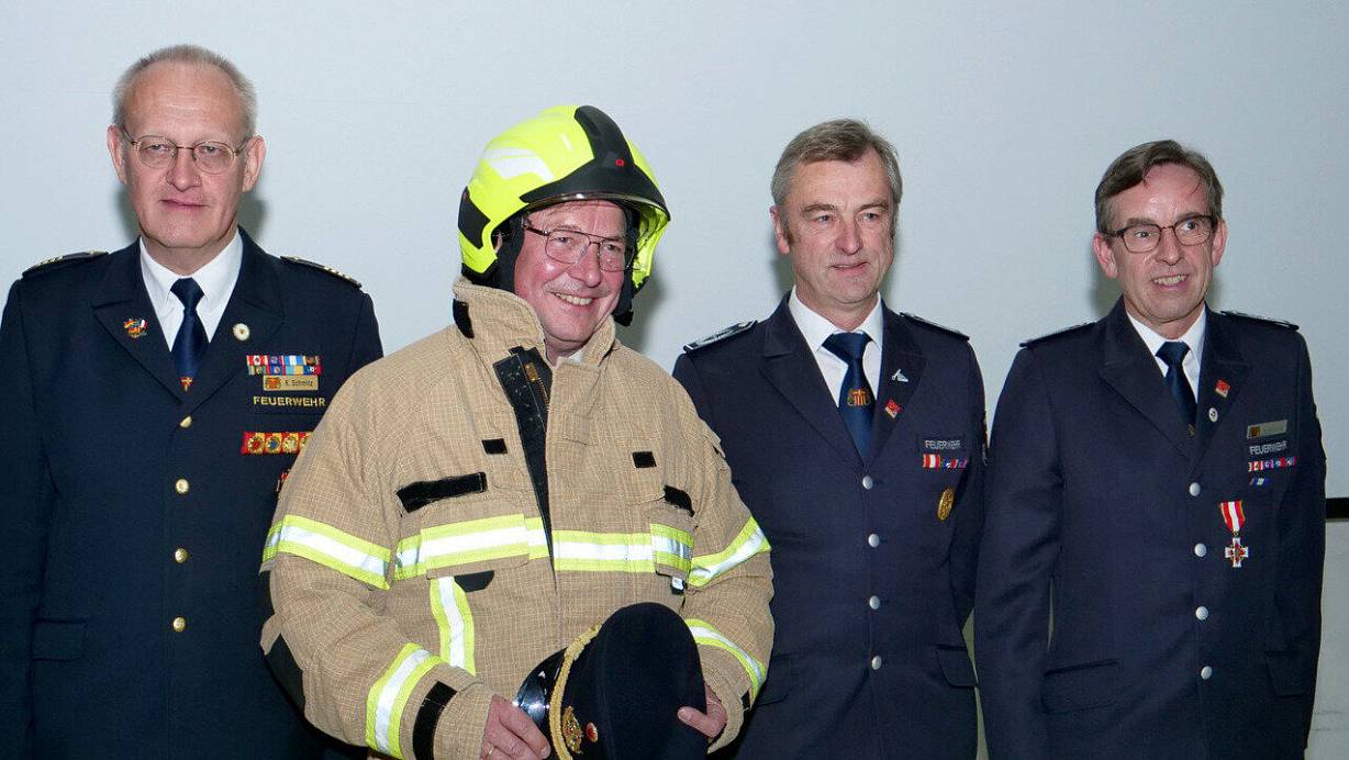 Paderborns Bürgermeister Michael Dreier wurde von der Wehrführung der Paderborner Feuerwehr eingekleidet und trägt die Rangabzeichen des Kreisbrandmeisters in Kombination mit dem Paderborner Stadtwappen. Auch die persönliche Schutzausrüstung mit Helm wurde ihm von (v. l.) Ralf Schmitz, Robert Siemensmeyer und Hubertus Henning überreicht., | © Ralph Meyer