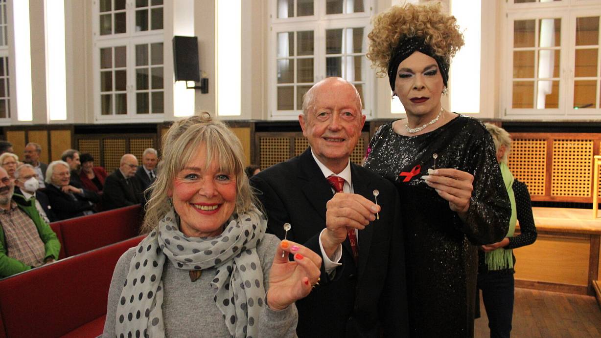 Antje Huißmann (v.l.), Otmar Allendorf und Carsten Schlussus präsentieren stolz die Kulturnadeln für ihr jahrelanges Engagement in Paderborns Kulturszene. | © Moritz Jülich
